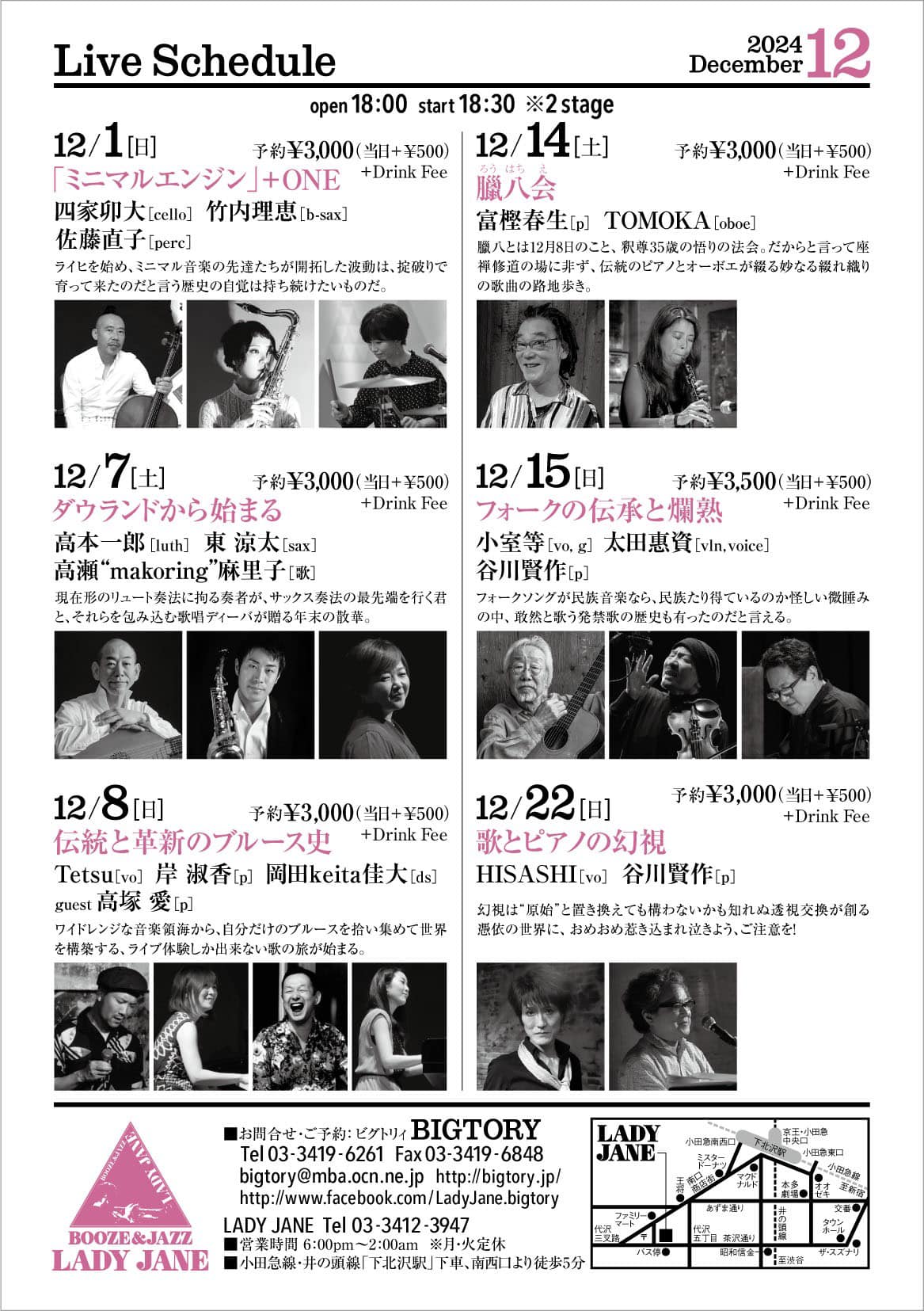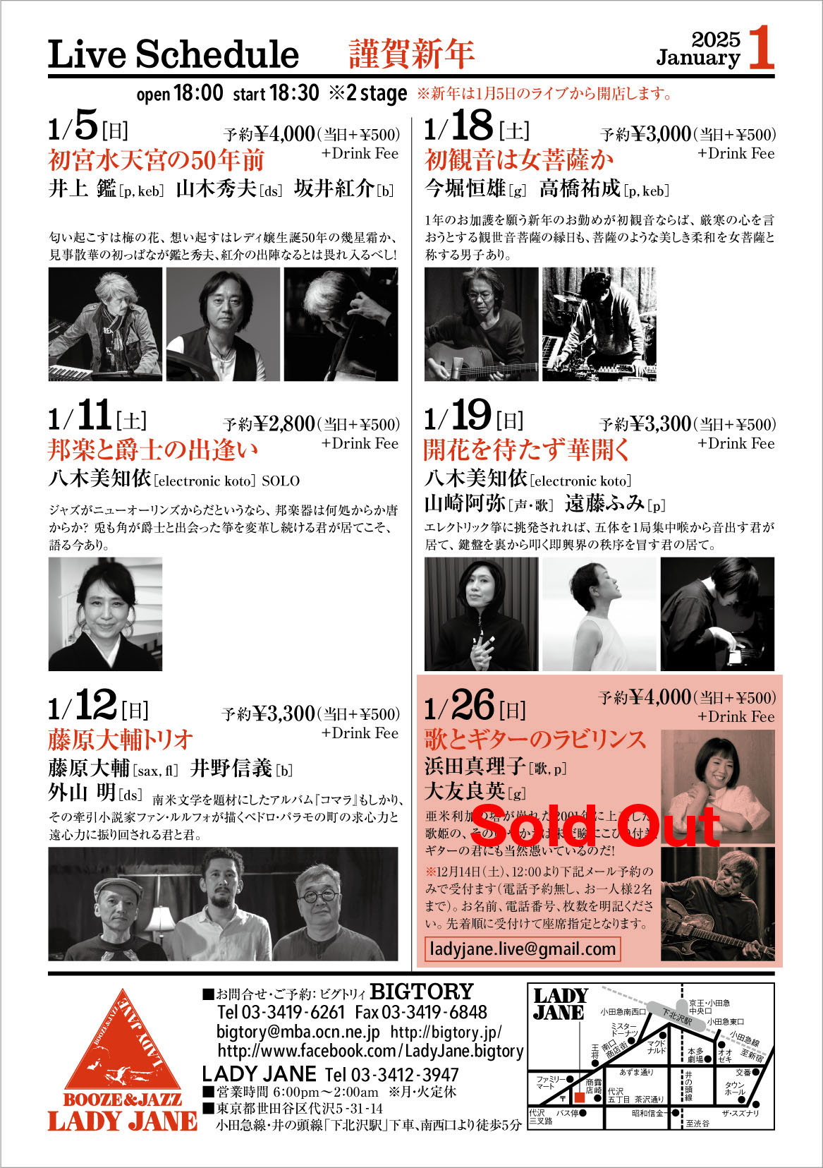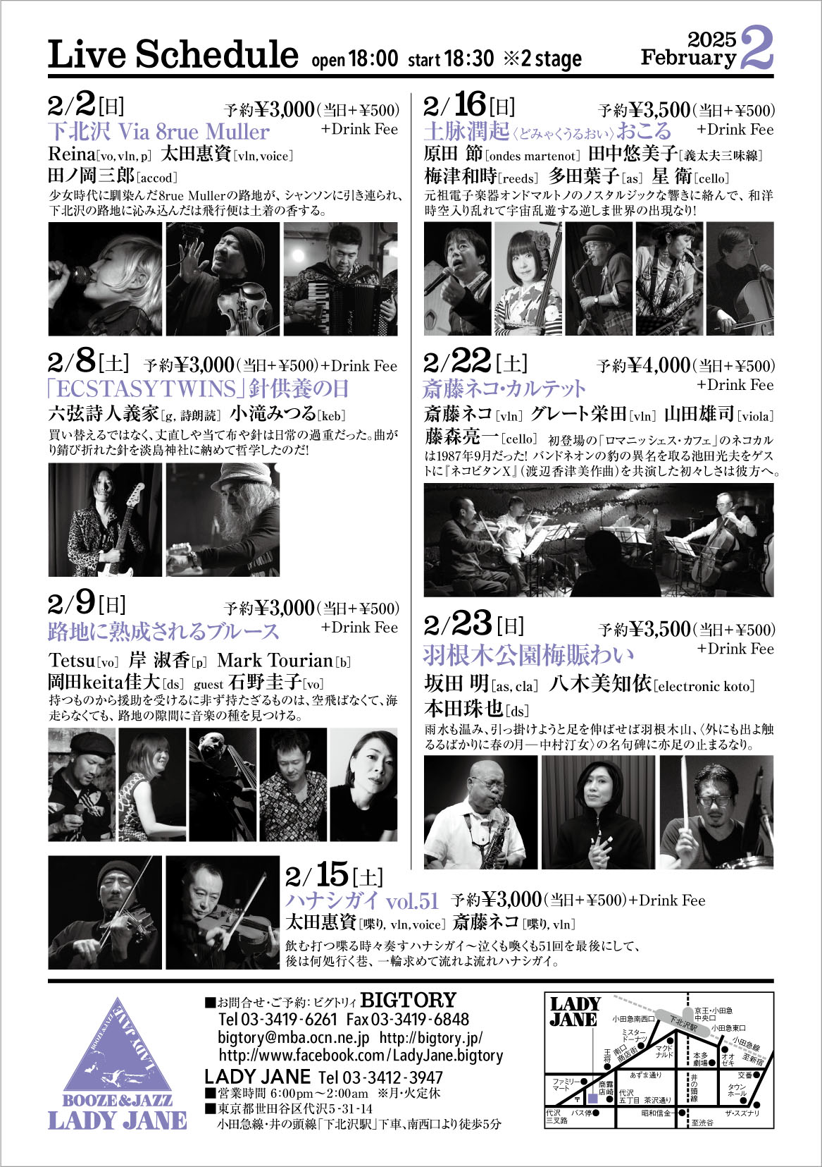 | 毎週末行われるLADY JANE Liveのスケジュ−ル。 2/23 up! 2025年3月 2025年2月 2025年1月 2024年12月 2024年11月 2024年10月 2024年9月 2024年8月 出演者による「日々雑感」。 vol.11 渋谷毅 |