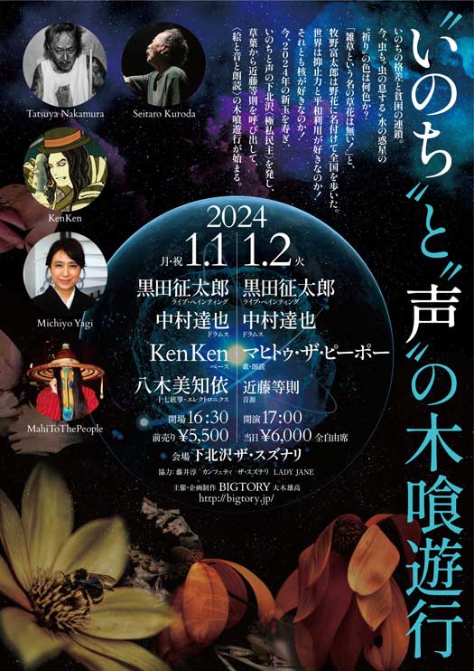 2024年1月1日(月)・2日(火) 下北沢 ザスズナリ 開場 16:30 / 開演 17:00 料金:前売5,500円 / 当日6,000円(全席自由) 1月1日(月) 黒田征太郎 [ライブ・ペインティング] 中村達也 [ドラムス] KenKen [ベース] 八木美知依 [エレクトリック二十一絃箏・エレクトロニクス] ◆ 1月2日(火) 黒田征太郎 [ライブ・ペインティング] 中村達也 [ドラムス] マヒトゥ・ザ・ピーポー [歌・朗読] 近藤等則 [音源のみ] 会場のご案内 小田急線下北沢駅東口・井の頭線下北沢駅中央口より徒歩4分 世田谷区北沢1-45-15(TEL:03-3469-0511) □チケットのお求めは カンフェティhttps://confetti-web.com/mokujikiyugyo カンフェティチケットセンター 0120-240-540(平日10〜18時) ビグトリィ bigtory★mba.ocn.ne.jp(★を@に変えて送信してください) TEL:03-3419-6261 協力:藤井淳, カンフェティ, ザ・スズナリ, LADY JANE |