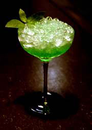 | ● ミント・フラッペ MINT FRAPPE (夏の氷山カクテル) ミントリキュール クラッシュド・アイス ミントの葉 細かく砕いた氷にミントリキュールをかけるだけのシンプルなカクテル。氷山をイメージしたカクテルにしては、その登頂制覇はオンナ、子供でも容易に出来る。夏の遊園地辺りで戯れると良い。 |